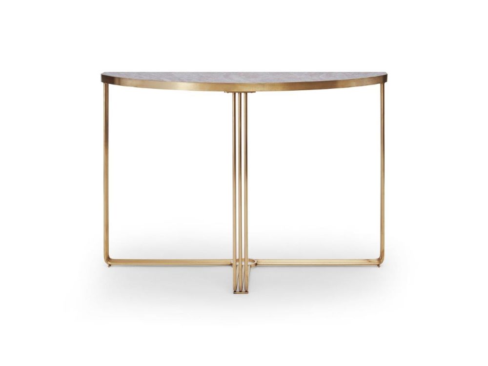 A unique half moon console table, carefully designed to add a touch of elegance and style to any living space, made with a grey stone laminate top and a golden frame.