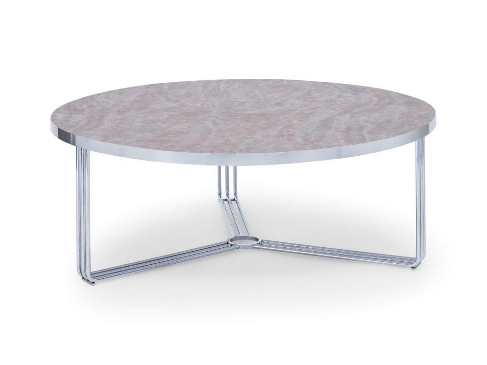 An exquisite and gorgeous large round stone laminate coffee table, made with a grey top and a polished chrome frame, the perfect choice to elevate your modern or contemporary home design.