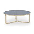 A sensational round coffee table, designed with a clear glass top, a golden pedestal and a concrete conical base, the perfect place to hold a colourful vase or any other decorative items.